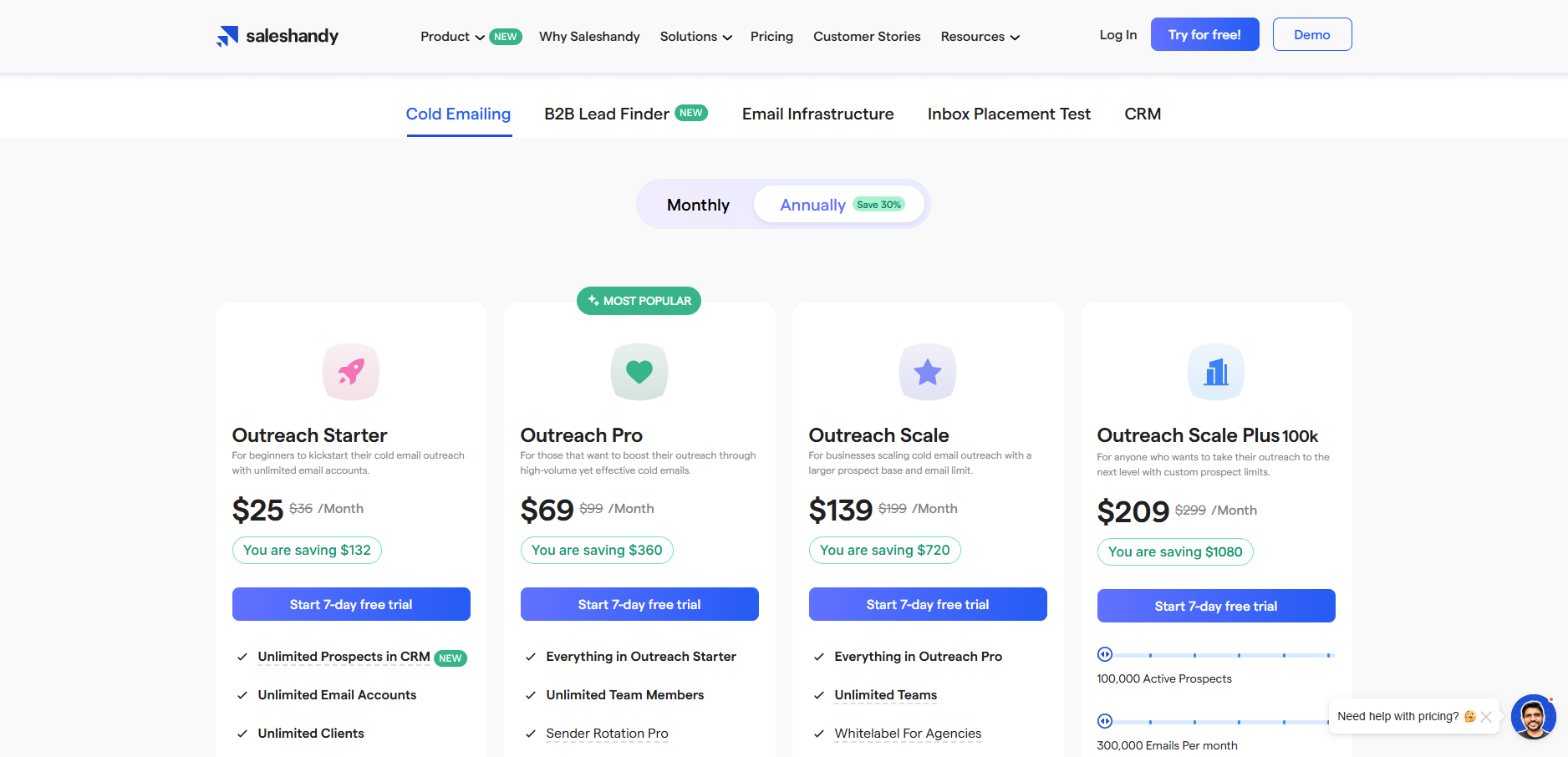 Saleshandy Email (+ lead data + infra) Simple all-in-one stack Lead finder + inbox setup in one tool Infra stability varies $25/month